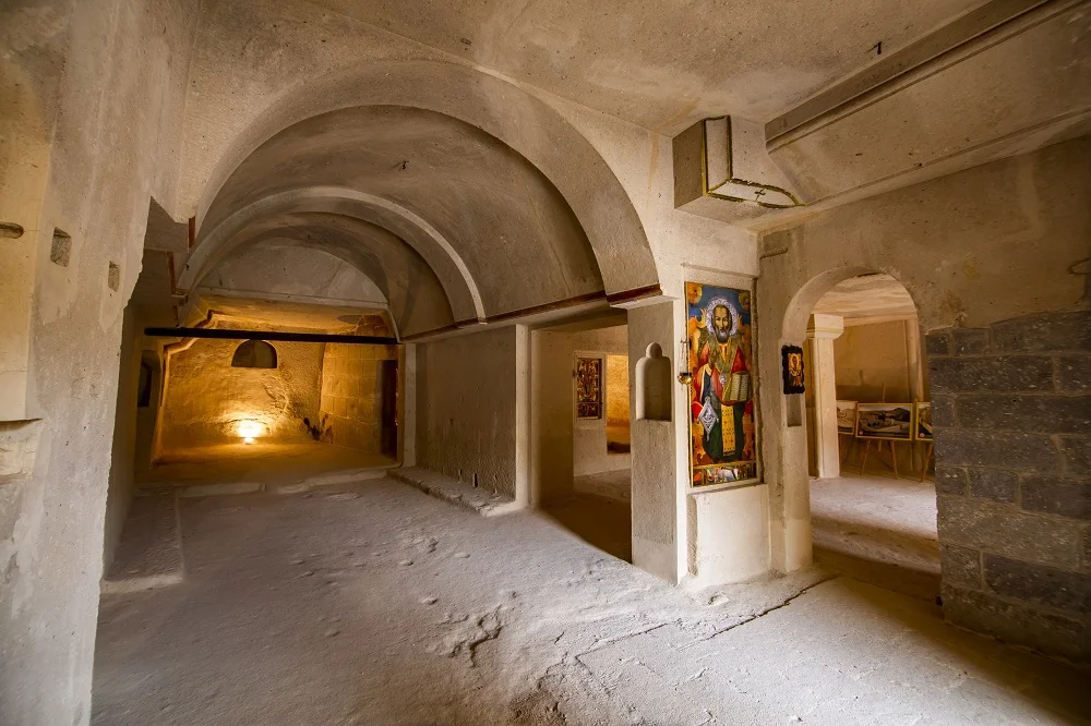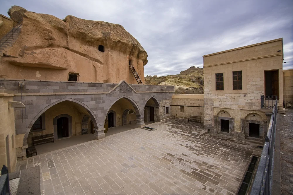 It is one of the sheltered cave structures made by carving tuff rocks such as many churches and monasteries in the Cappadocia region. It consists of two separate churches dedicated to the archangel Michael and Saint Stefanos, who is considered the first martyr of the Christian world, ayazma, a dining hall, a clothery, a kitchen, a school, a meeting room, a winery and a house where the monk and priests stayed.